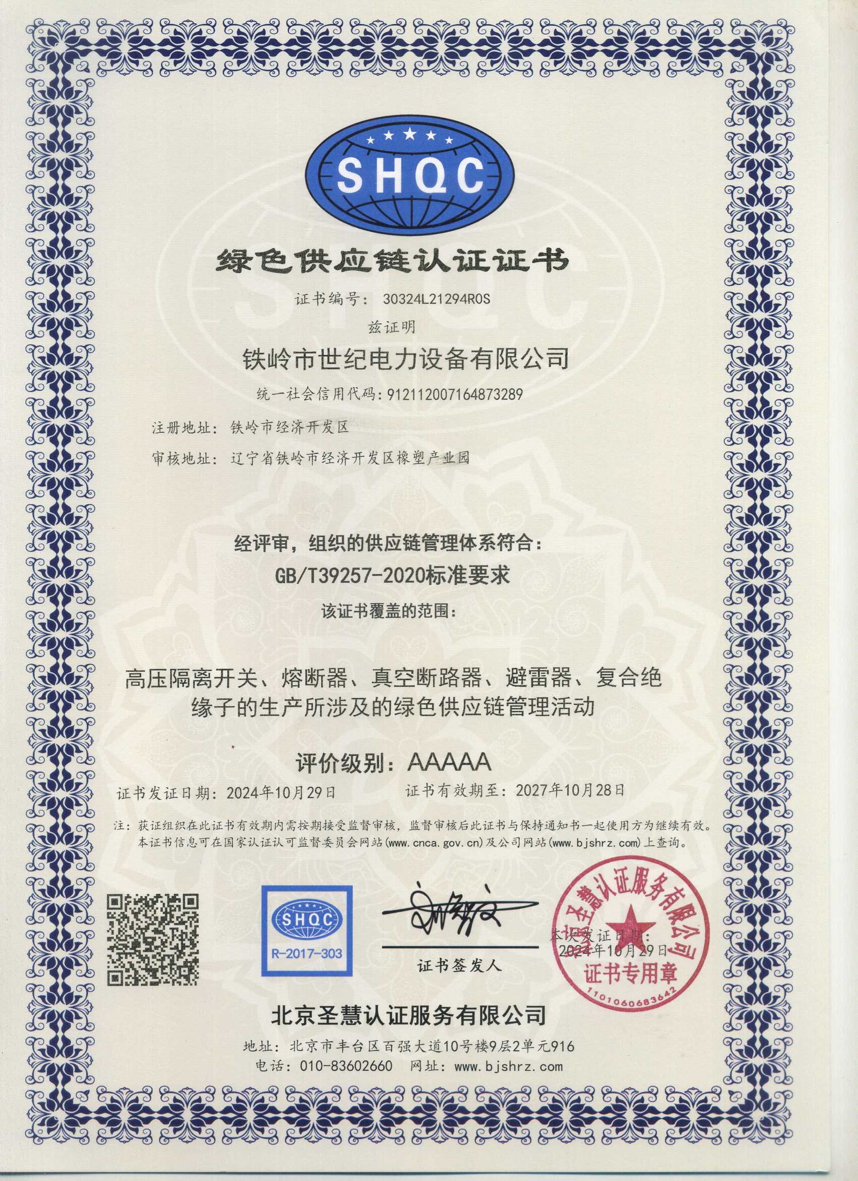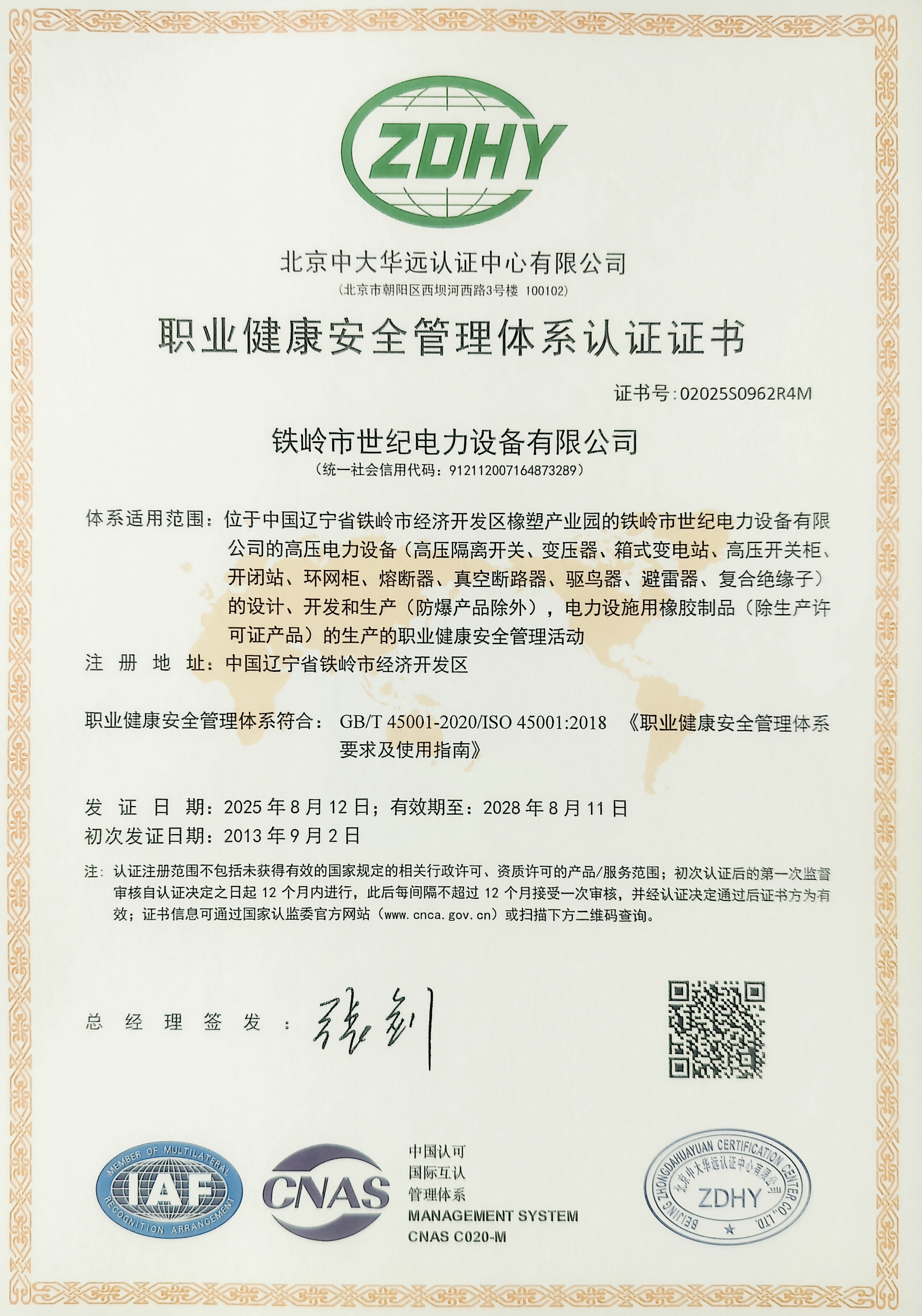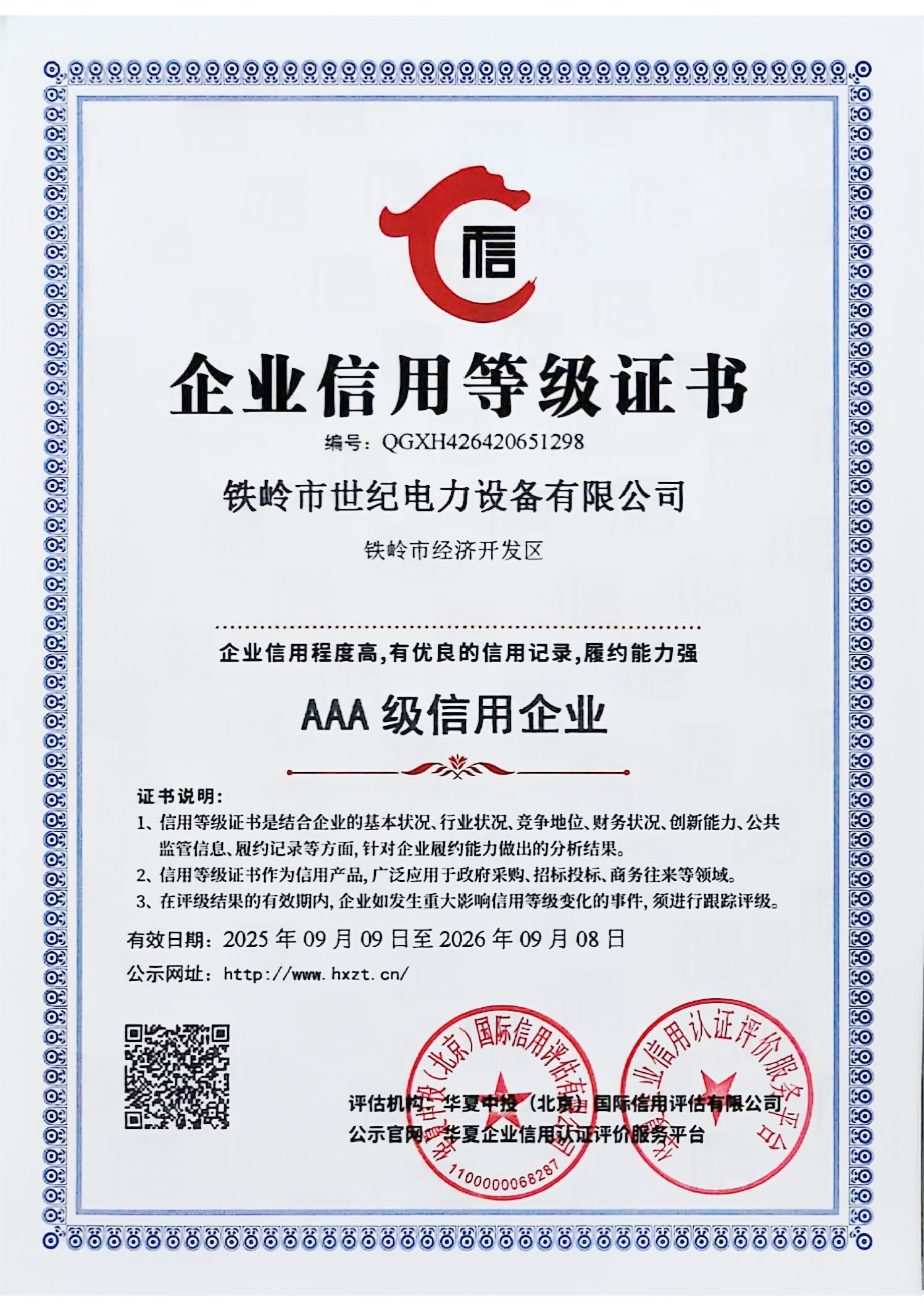 鐵嶺市世紀(jì)電力設(shè)備有限公司是集科研開發(fā)、生產(chǎn)制造、用戶服務(wù)于一體的國家高新技術(shù)企業(yè),始建于1999年,位于鐵嶺經(jīng)濟開發(fā)區(qū),占地面積5萬余平方米,建筑面積2萬余平方米。主要從事國家電網(wǎng)配套戶外高低壓隔離開關(guān)、電力電纜、變壓器成套裝置、高低壓開關(guān)柜、箱式變電站、絕緣子等產(chǎn)品的研發(fā)、生產(chǎn)和銷售。公司現(xiàn)有國家發(fā)明專利6項、實用新型專利9項,公司通過了ISO9001國際質(zhì)量管理體系認(rèn)證、ISO14001環(huán)境管理體系認(rèn)證和ISO 45001職業(yè)健康安全體系認(rèn)證。
